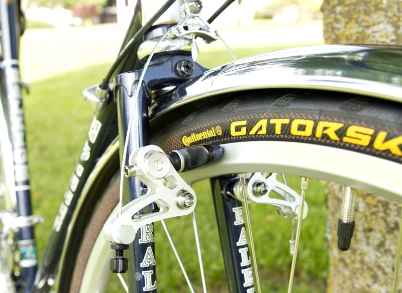 The Suntour hubs were a clear winner for the build. They were polished to a high shine then carefully married to a new set of Velocity Synergy 27″ wheels with Wheelsmith doubled butted spokes along with tried and true Continental Gatorskin tires. These tires have been a staple for many of my builds with a reputation as nearly bulletproof in terms of flat protection and wear longevity.