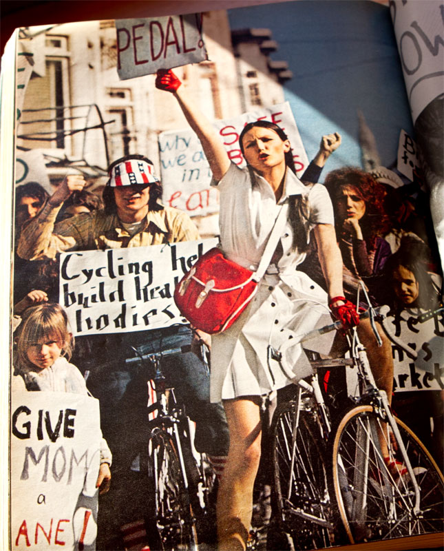 When I first saw the powerful image of the woman with the red bag that oozed early seventies bicycle advocacy in a time when the country transitioned from bicycles as toys to legitimate modes of transportation, I had assumed that the rest of the images would all be very similar and relevant to that revolution. And although the next two images below show wonderfully strong women with passion and fire for bicycle roadway justice, I realized quickly through flipping, through the remaining pages, that Mademoiselle was really just pushing the latest fashions. And perhaps, even the latest hot trend of cycling and the thrill of protesting for its acceptance.