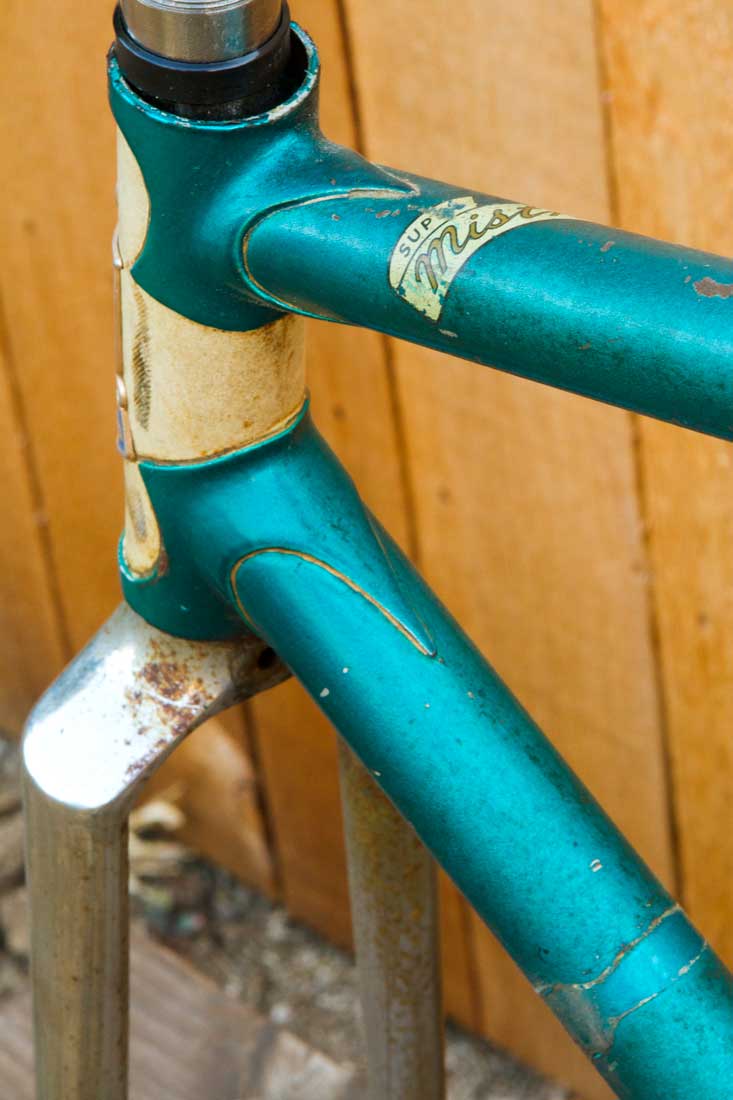 In the world of vintage bicycles, there are a numbers of ways to say so long. After many, many decades, a steel frame may fail to the point where fixing it doesn’t make sense. A frame may be involved in a crash, rendering it damaged beyond repair. An reliable old friend may be sold and the relationship ended. Or, such as this case, what was once a high-end frame adorned with flawless, vibrant paint, razor sharp decals and expertly done lug lining, has now decayed into only a shell of what once was on the outside.