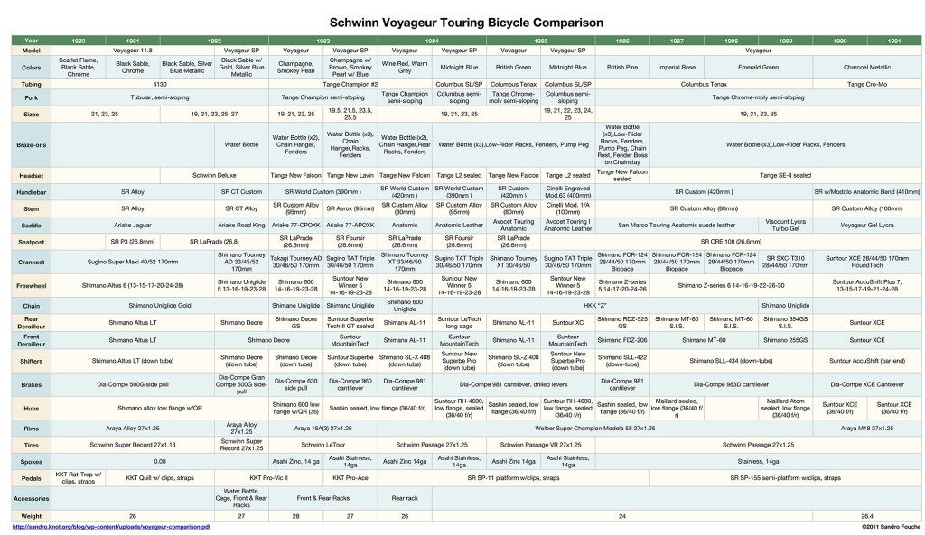 Below a comparison chart, created by Sandro Fouche, shows the specs of the various Voyageur models from 1980 to 1991. Maybe the answer to desirability is decoded within the numbers and components?